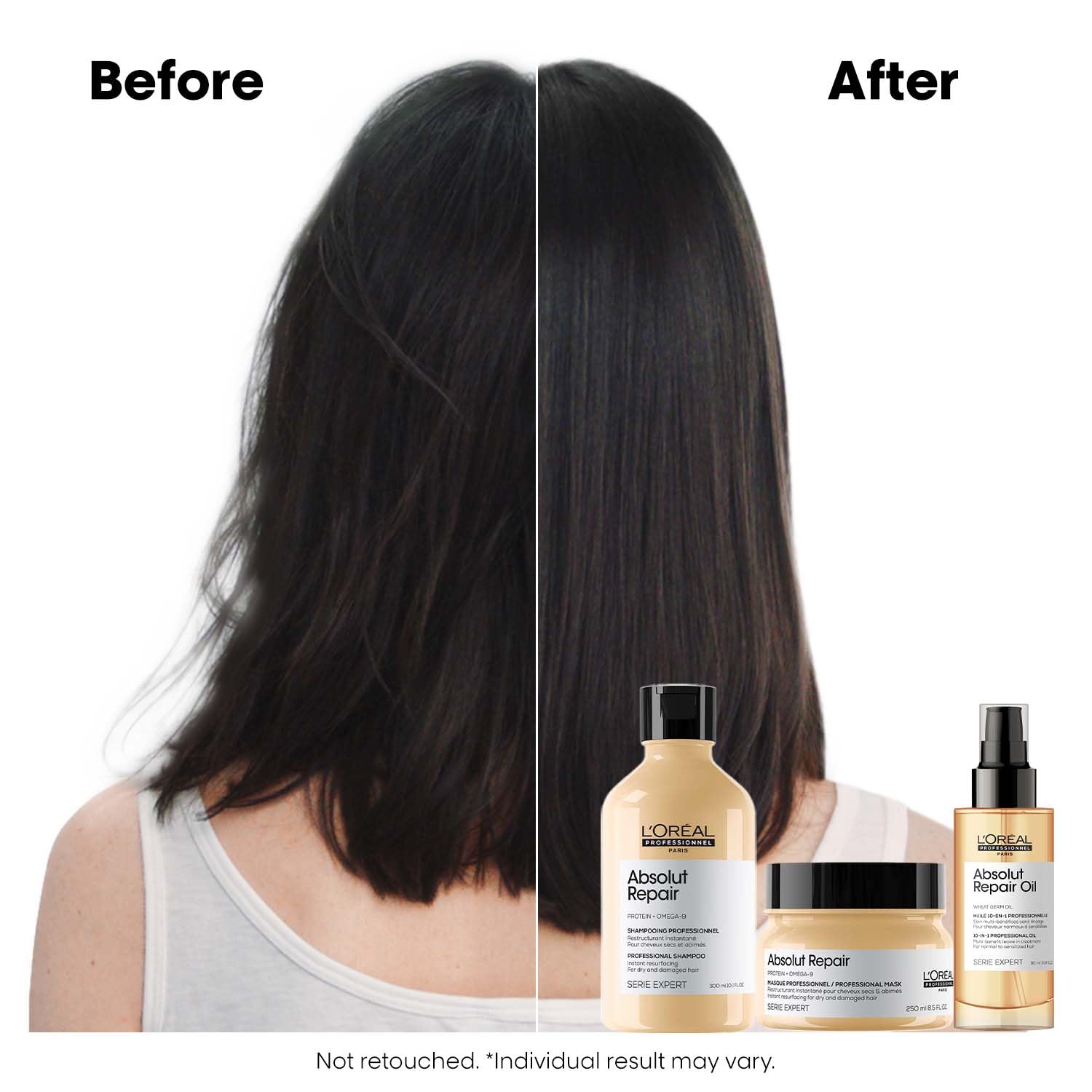 Studies show that the Absolut Repair formula can help reduce hair surface damage by up to 77% and make hair upto 7× shinier, while improving resistance to breakage when used as part of the Absolut Repair routine.